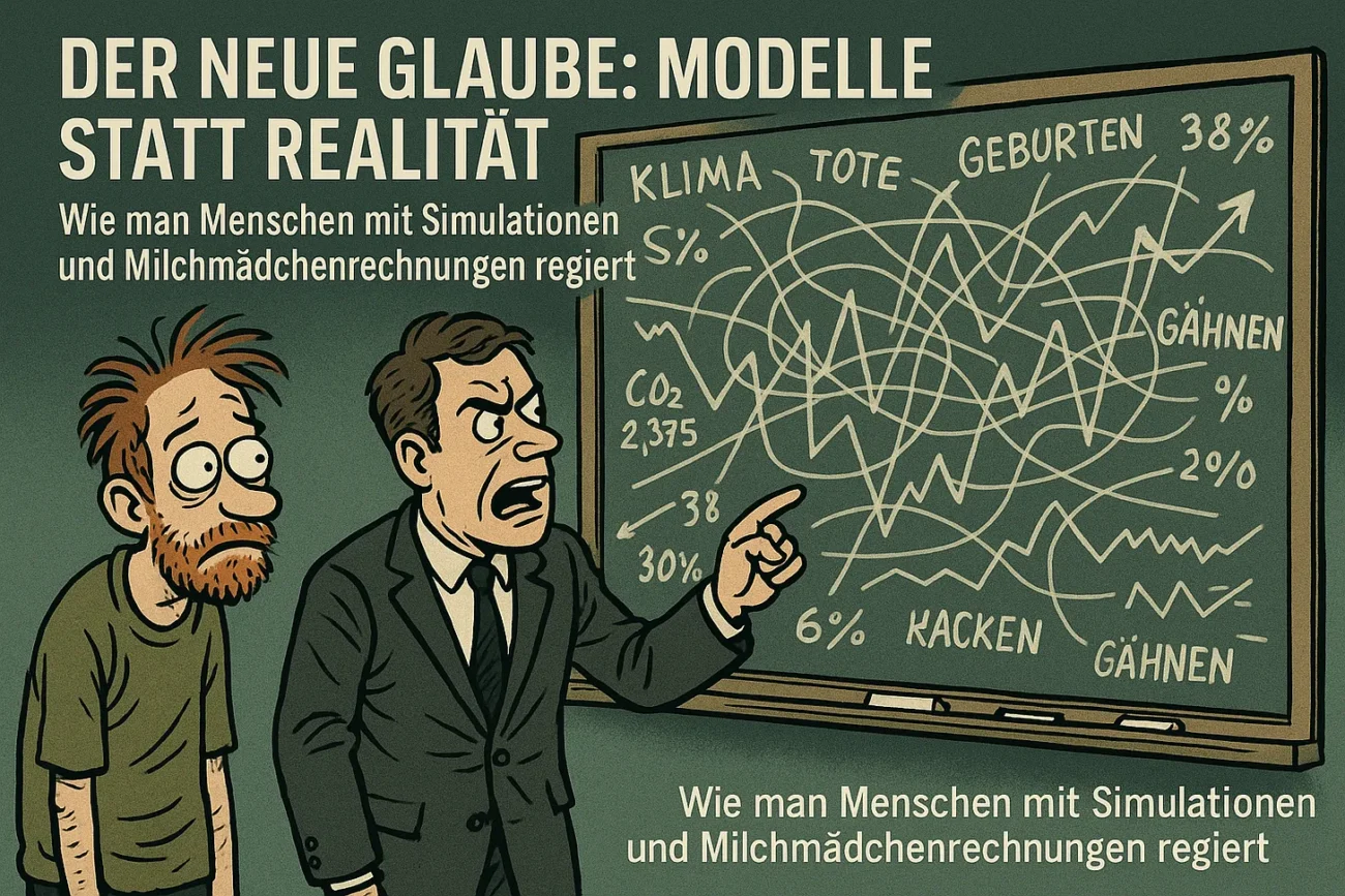 Die Moderne hat einen neuen Gott: die Computersimulation. Nicht das, was IST, sondern das, was jemand BEHAUPTET, das irgendwann sein könnte – errechnet in einem PC, nicht aus Beobachtungen. Und damit wird dann politisch hantiert, als wäre es eine Berechnung für den Kredit deiner Wohnung, entworfen nicht in Excel, sondern auf einem Supercomputer. Gefüttert mit irgendwelchen Daten übereifriger Wissenschaftler, die vorsichtshalber – und nur zu unserem Wohle – lieber noch eine Schippe drauflegen. Denn man weiß ja nie…