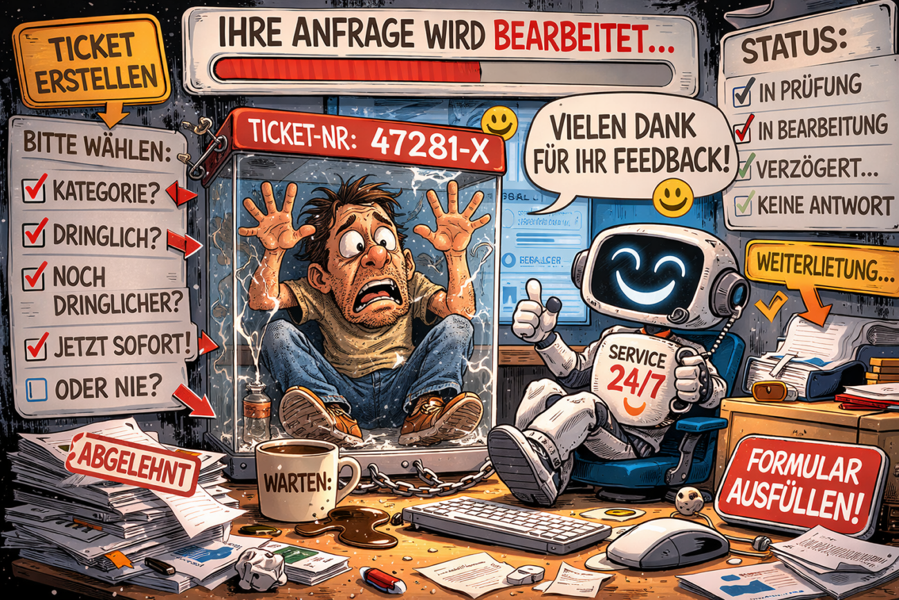 Der Support ist keine Kommunikation mehr. Er ist eine Simulation menschlicher Anwesenheit – ungefähr so lebendig wie eine Lautsprecher-Durchsage auf einem Bahnhof.